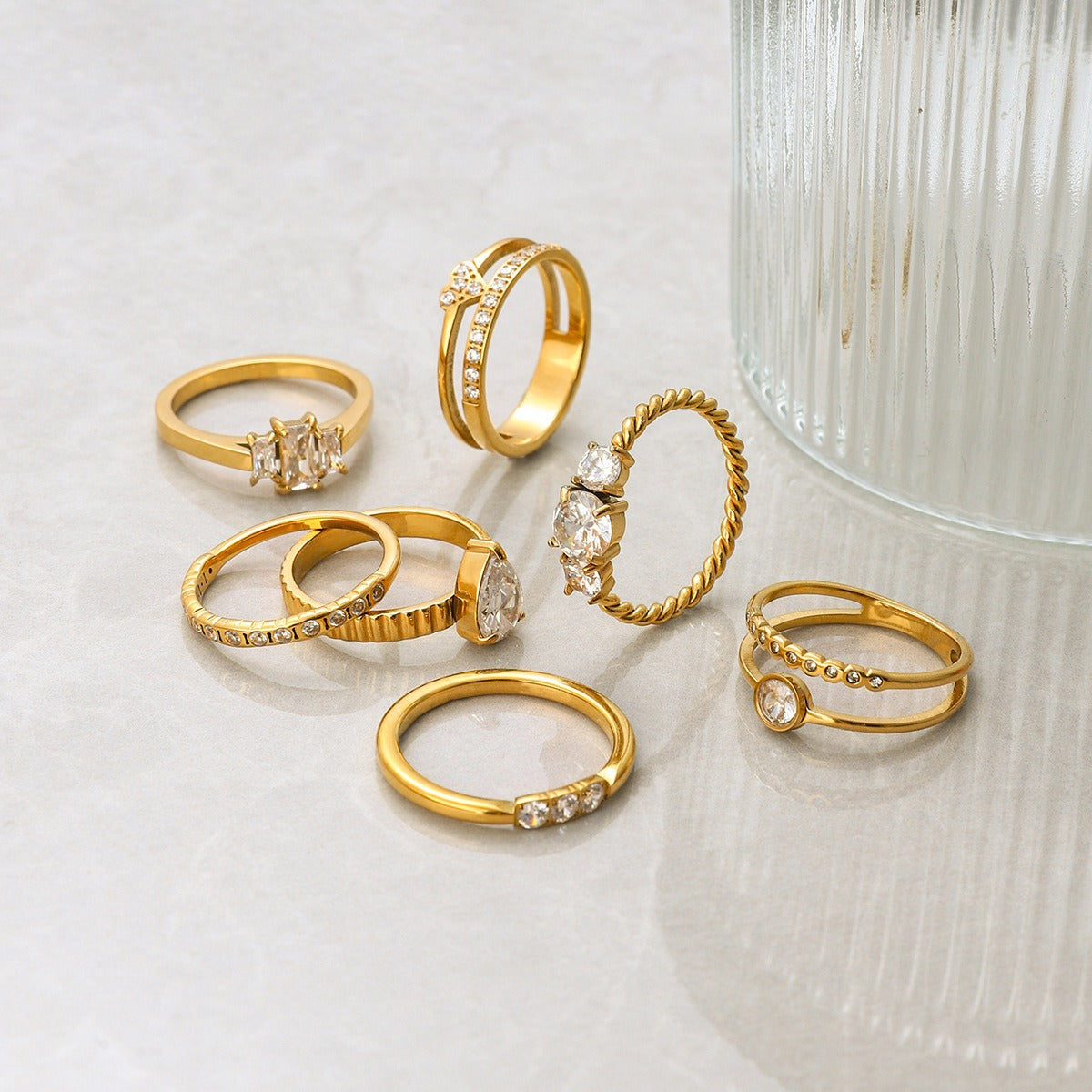 This stunning ring collection showcases seven distinct elegant designs, each with its own unique character and sophisticated appeal. From delicate bands to statement pieces, this collection offers versatile styling options for the modern jewelry enthusiast. Each design maintains the collection's signature elegant aesthetic while providing its own distinctive visual charm.